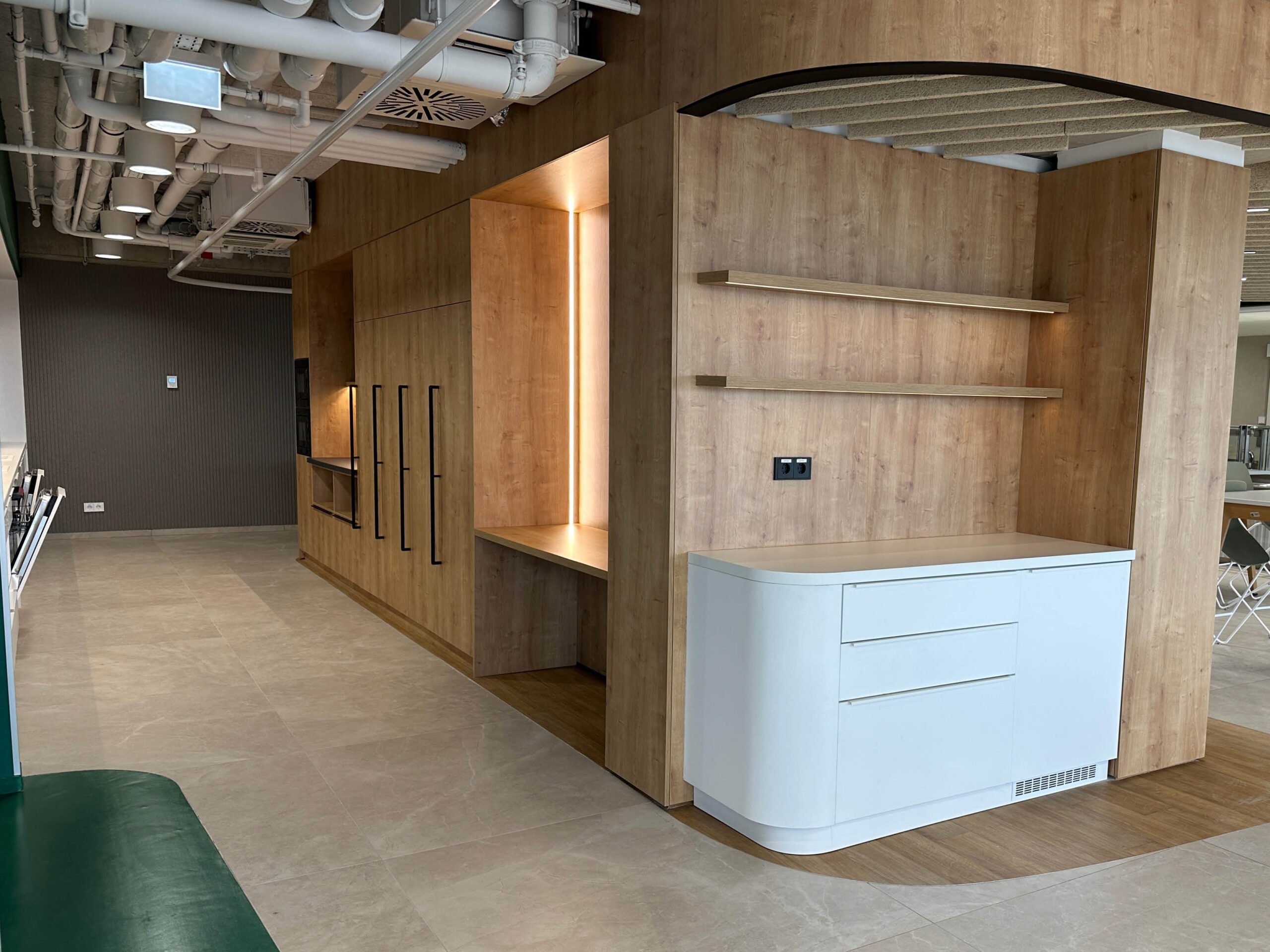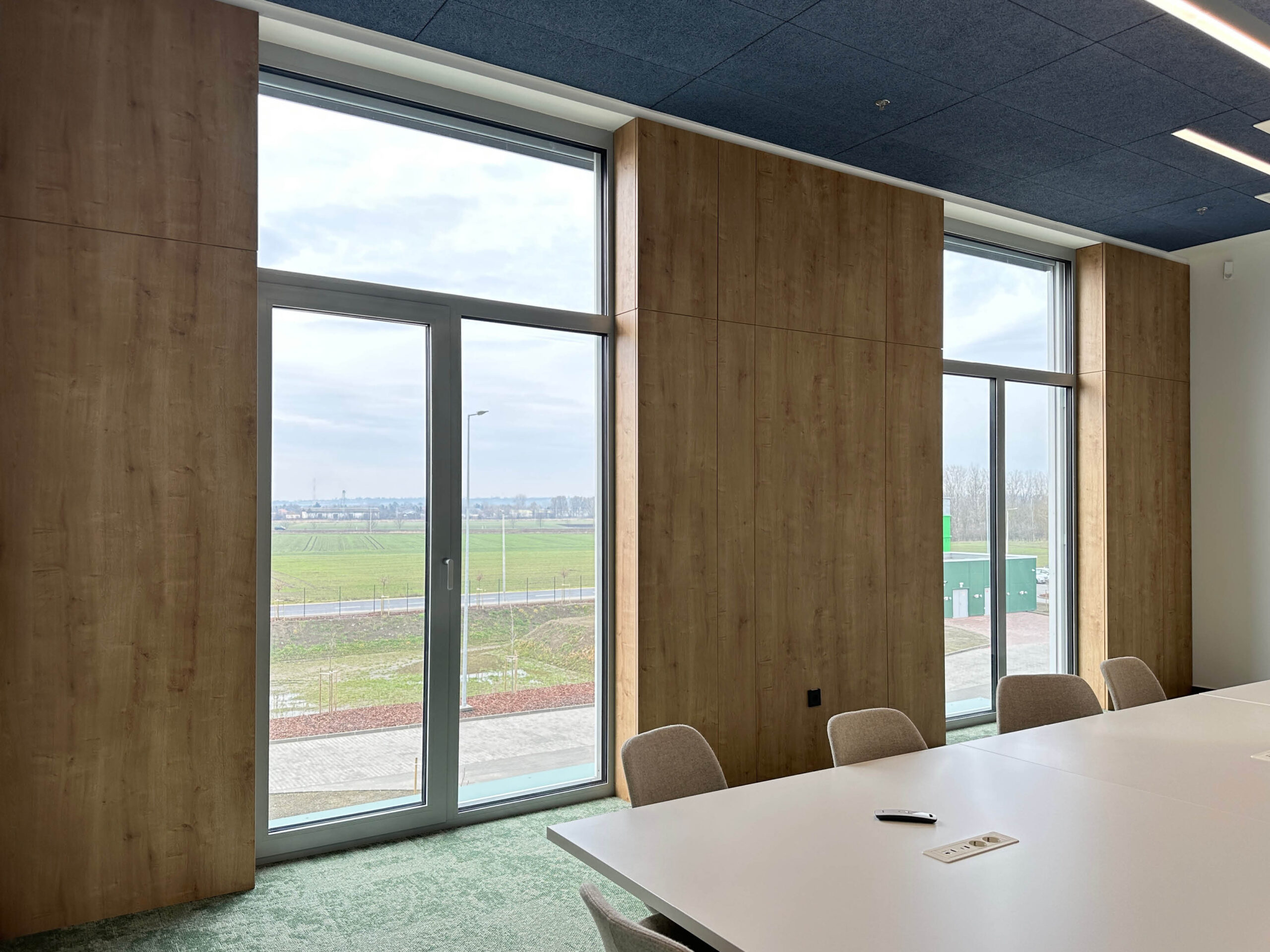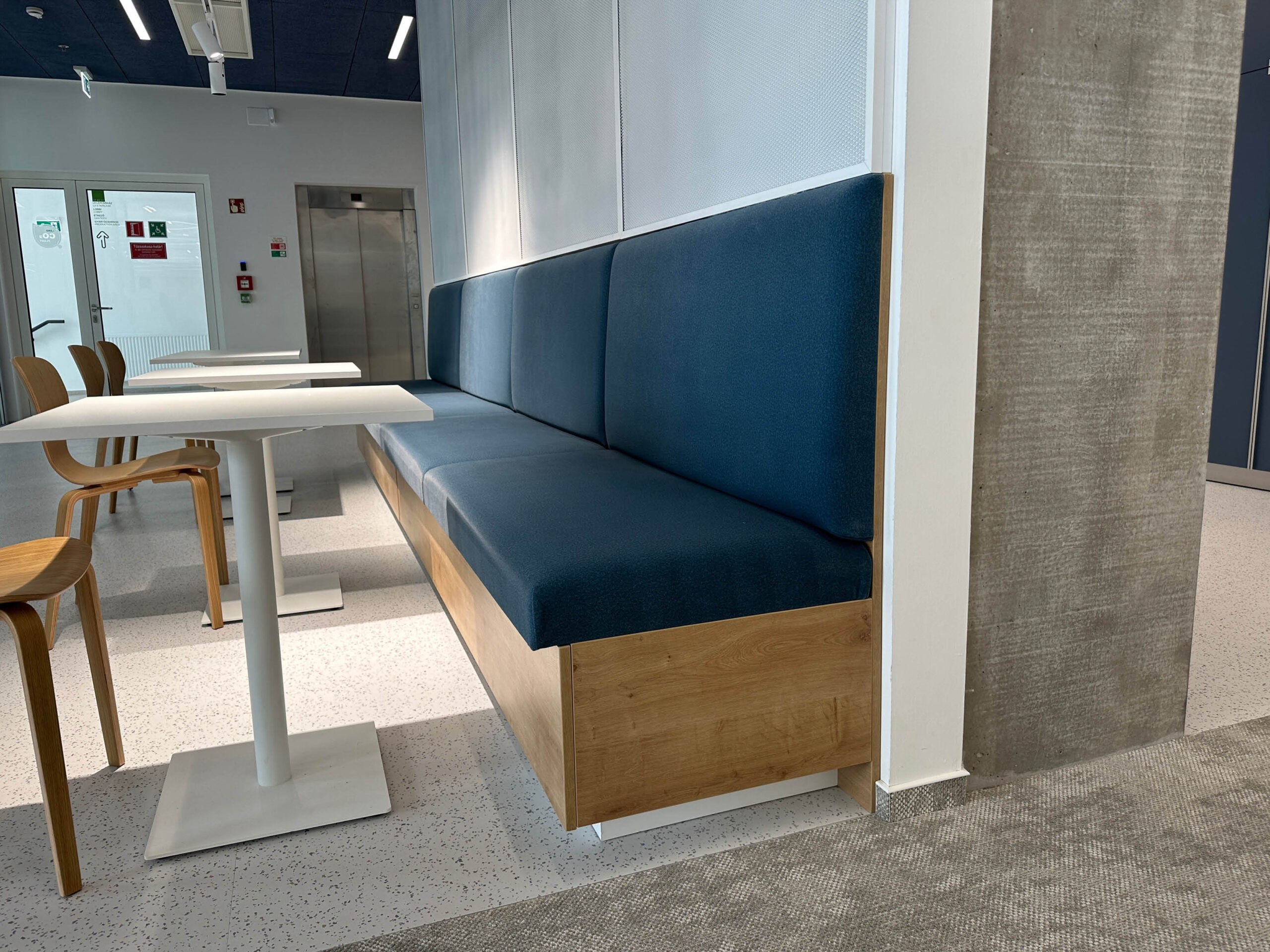 A projekt részeként speciális akusztikus panelek kerültek alkalmazásra, amelyek az irodai terek hangcsillapítását szolgálják. A kávézó területén tölgy kivitelű konyhabútor készült, míg az irodai terekben egységes megjelenésű falburkolatok kerültek beépítésre.
