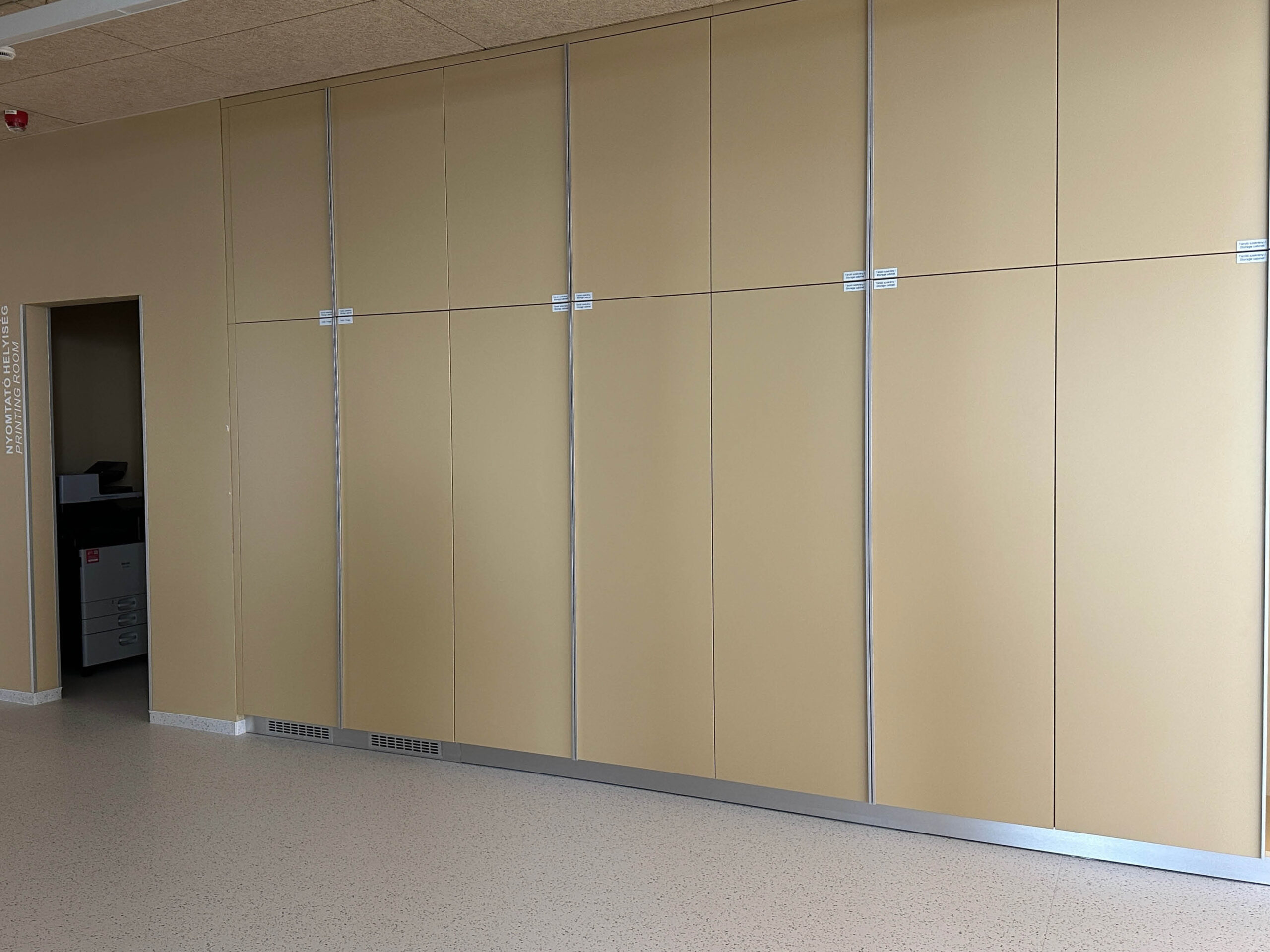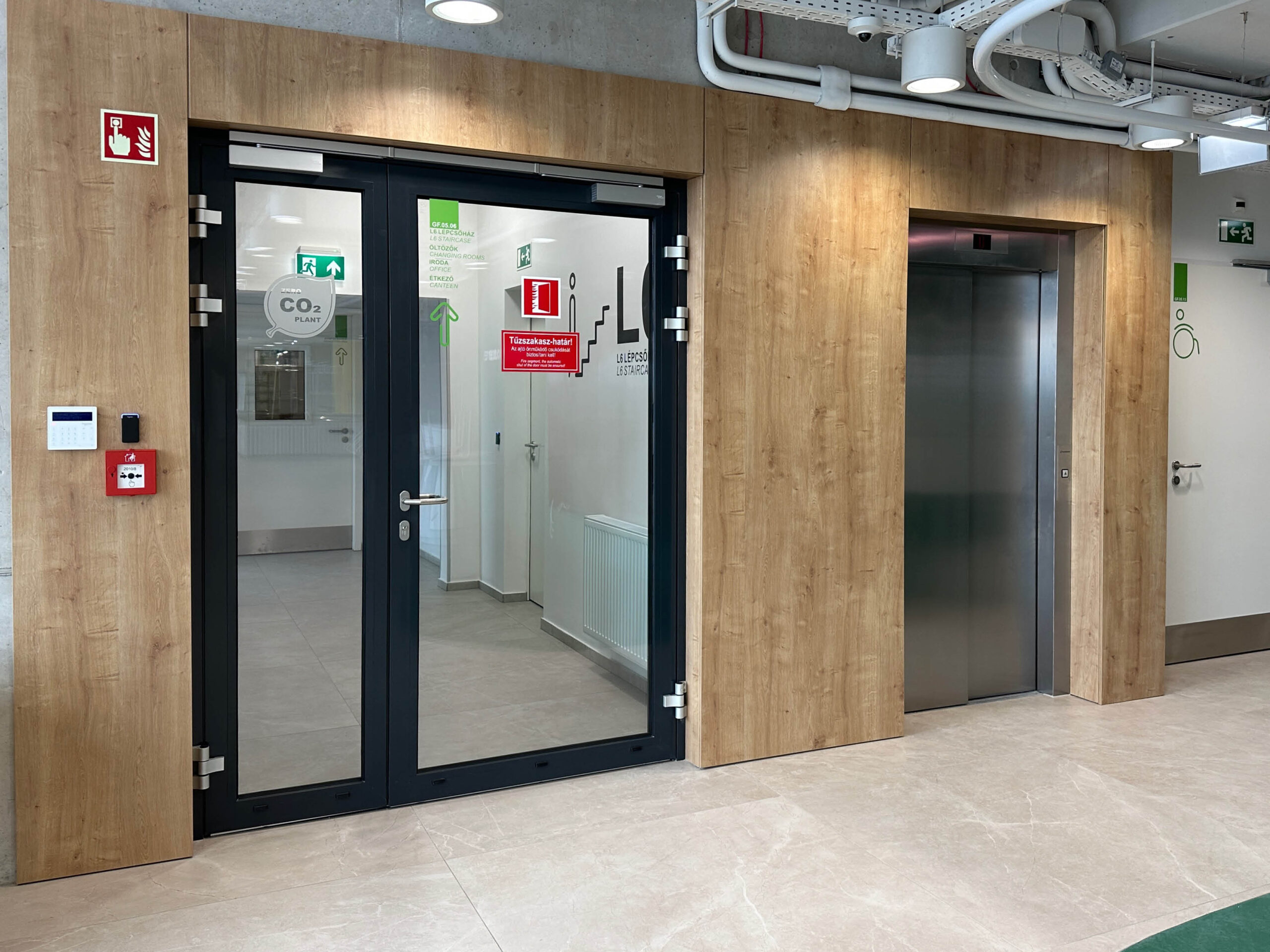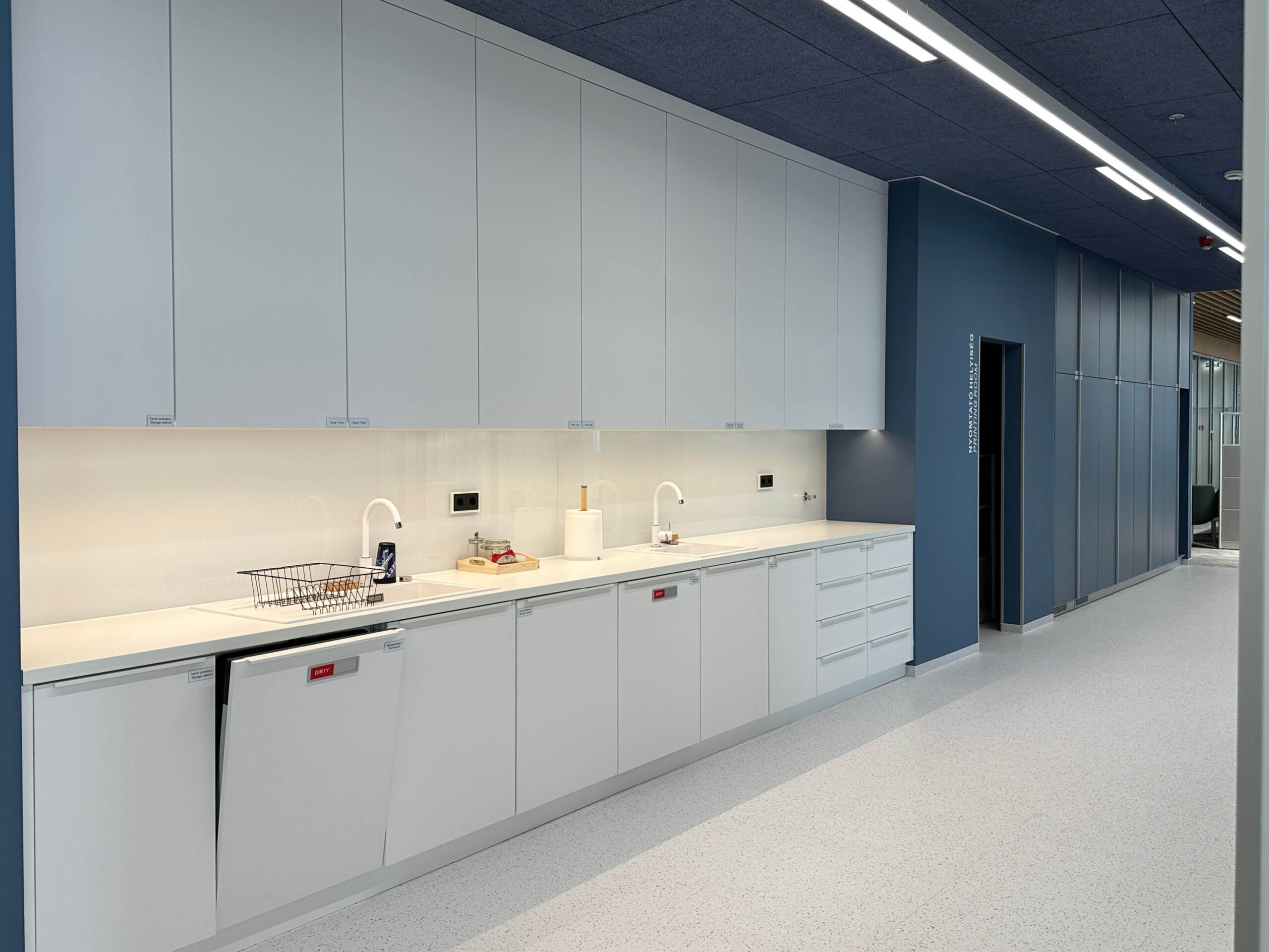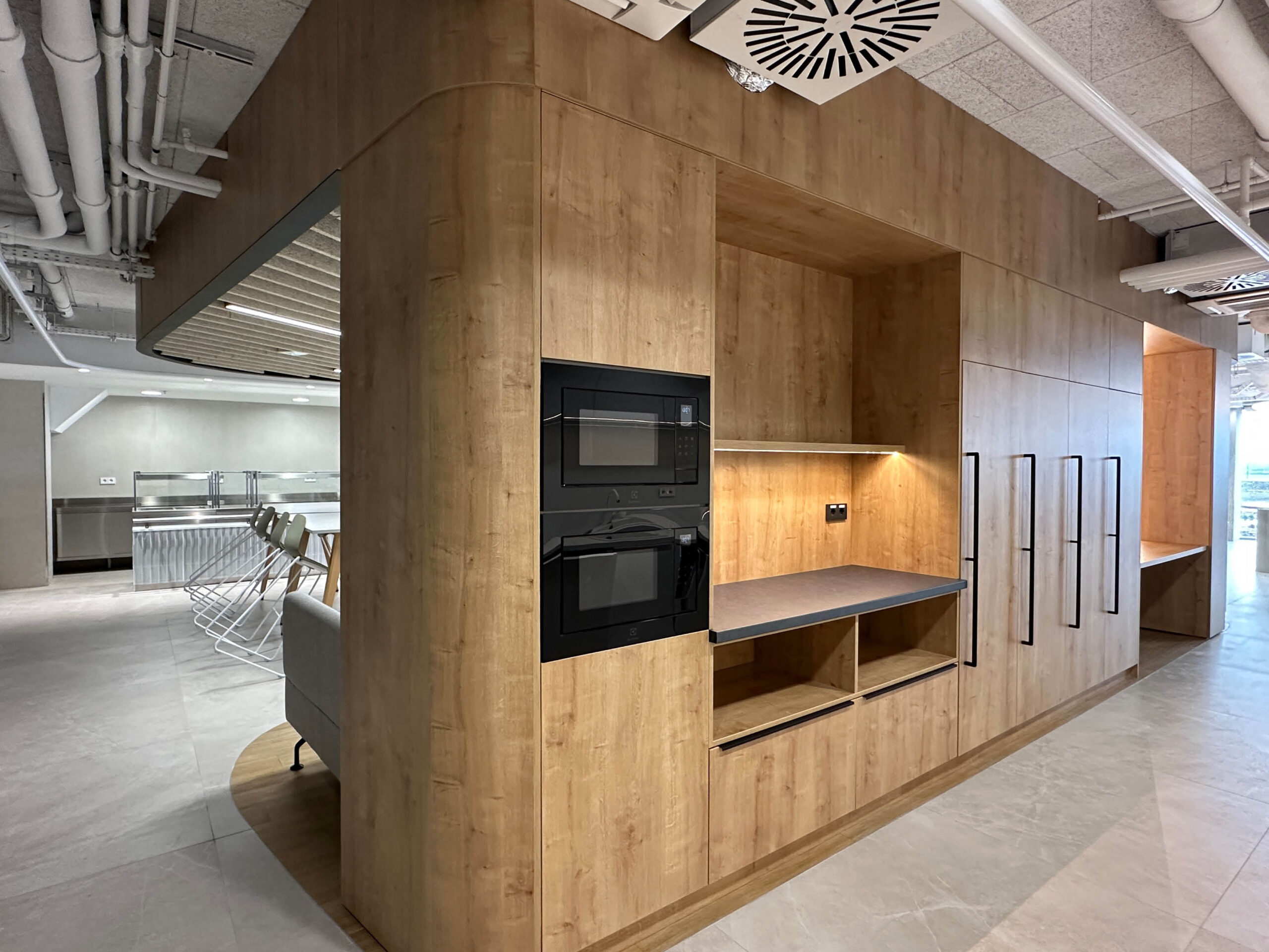 A projekt részeként speciális akusztikus panelek kerültek alkalmazásra, amelyek az irodai terek hangcsillapítását szolgálják. A kávézó területén tölgy kivitelű konyhabútor készült, míg az irodai terekben egységes megjelenésű falburkolatok kerültek beépítésre.